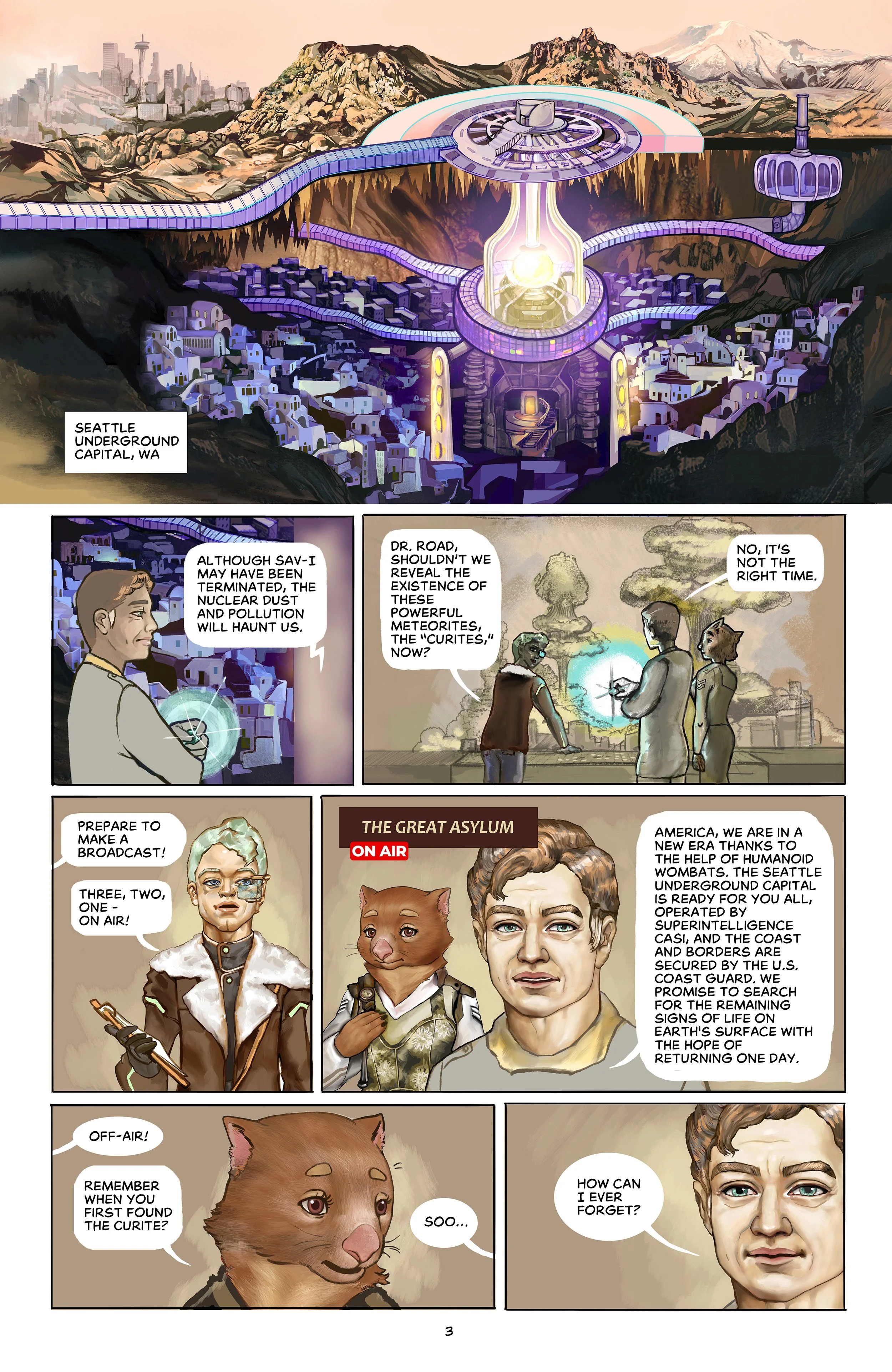 AARA is set on a futuristic, polluted Earth. The inhabitants of what remains of Seattle have built an underground city that relies on AI technology for survival. When a famine hits, they evict their only companions, a race of wombats with human-like intelligence. Everything changes when the protagonist, an albino wombat named Aara, discovers her ability to summon magical meteorites with purifying powers to combat the planet’s pollution. With the help of the U.S. Coast Guard and some new friends, Aara must battle terrorists who would take the meteorites only for themselves. Aara embarks on a spectacular quest across the West Coast and Pacific Ocean to restore life on Earth.